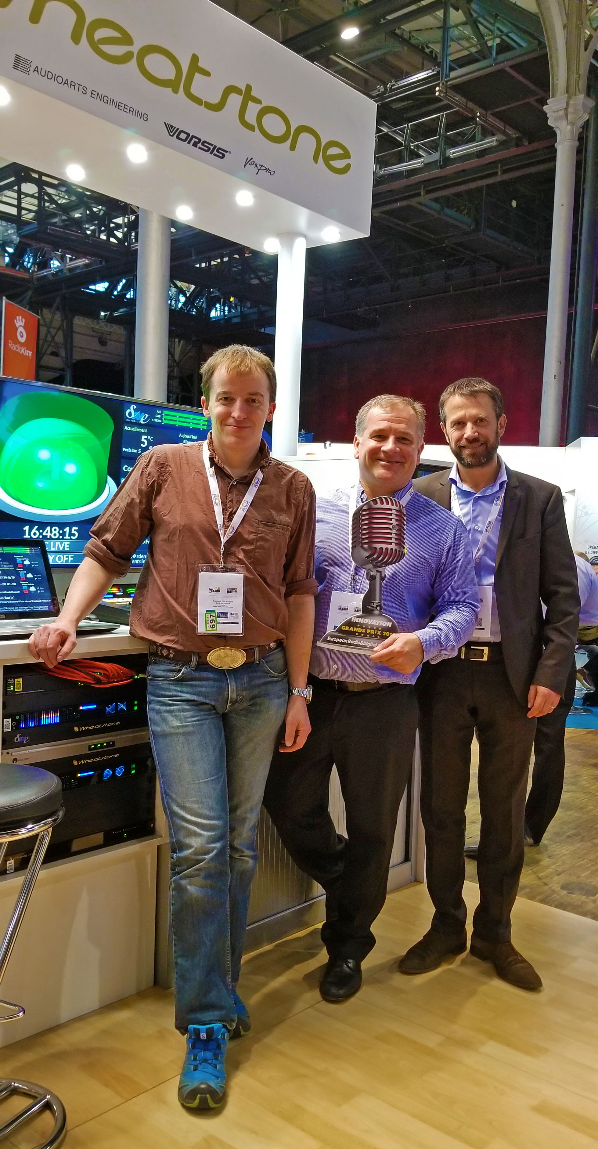 Photo 1 (top) : Seen here with the Innovation award are Wheatstone’s Director of Sales, Jay Tyler (center) and SAVE Diffusion France’s Raphael Dolmazon (left) and Paul Guibouret (right).