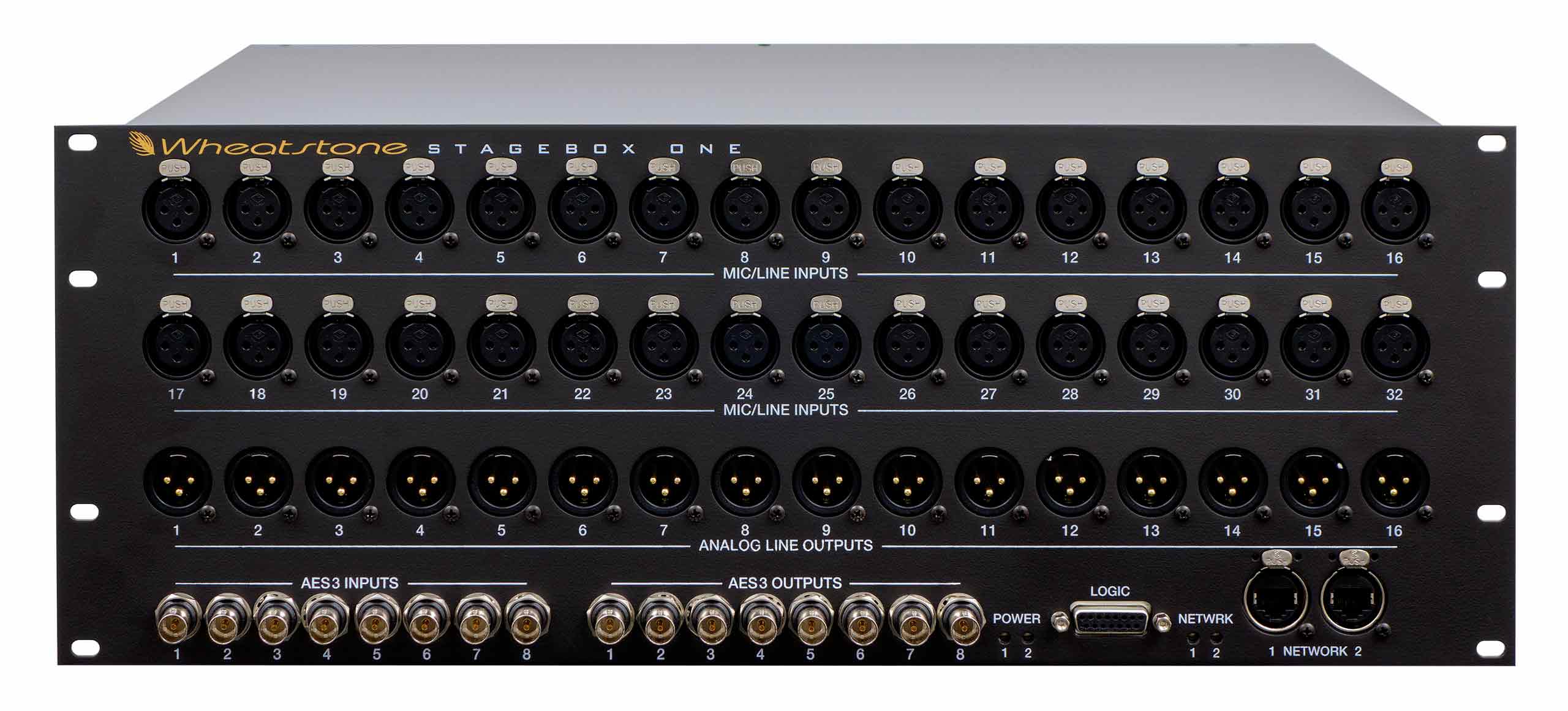 WheatNet-IP audio network I/O Stagebox One and a single CAT5e/or 6 cable can be used to connect a wall of plug-ins to the control room.